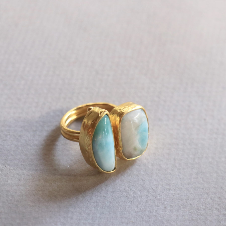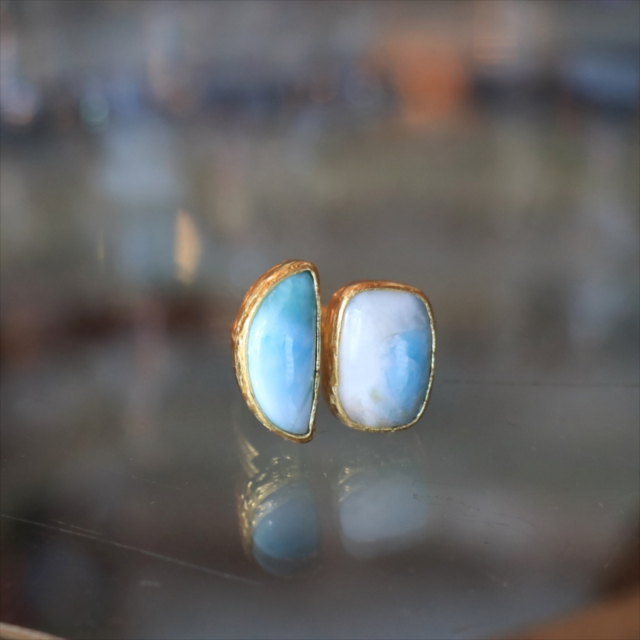 海に映る雲のような模様が広がる、優しいブルーが美しいラリマーダブルリングです。、半月形と丸みのあるスクエア形の2粒のラリマー。その絶妙なバランスは、シンプルでいて印象的に手元を美しくみせてくれます。