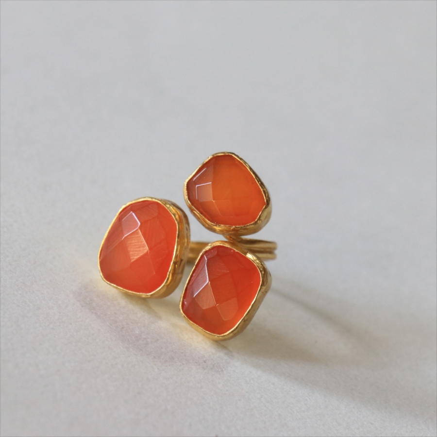 半透明のオレンジ色がきれいなカーネリアン3粒のリングです。カーネリアンは不純物もほとんどなく均一な色で、それだけに3つの石の形がひとつひとつ際立って見えます。それぞれの石にぴったりの枠を作る職人さんの丁寧な仕事が光る逸品です。