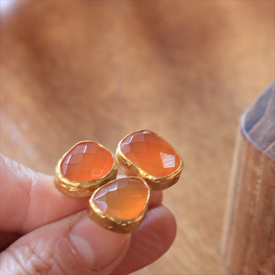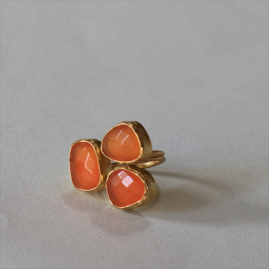 半透明のオレンジ色がきれいなカーネリアン3粒のリングです。カーネリアンは不純物もほとんどなく均一な色で、それだけに3つの石の形がひとつひとつ際立って見えます。それぞれの石にぴったりの枠を作る職人さんの丁寧な仕事が光る逸品です。