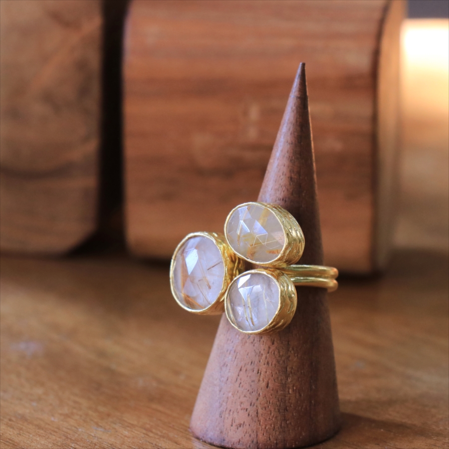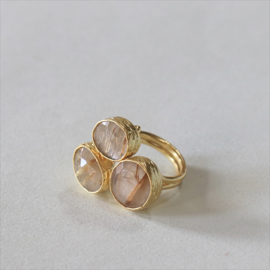 天然のクォーツに針のようなインクルージョンがはいったルチルクォーツのリングです。同じシリーズの3つの石リングの中では、やや小振りで、普段使いでも活躍しそう。肌なじみの良いカラーは違和感なく、合わせやすくおすすめです。