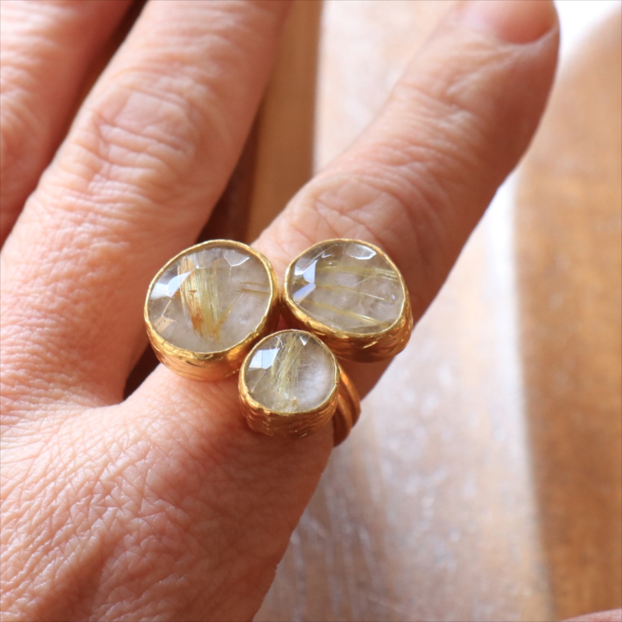 天然のクォーツに針のようなインクルージョンがはいったルチルクォーツのリングです。同じシリーズの3つの石リングの中では、やや小振りで、普段使いでも活躍しそう。肌なじみの良いカラーは違和感なく、合わせやすくおすすめです。