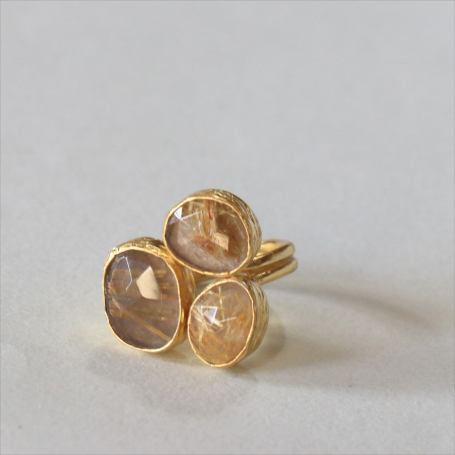 天然のクォーツに針のようなインクルージョンがはいったルチルクォーツのリングです。同じシリーズの3つの石リングの中では、やや小振りで、普段使いでも活躍しそう。肌なじみの良いカラーは違和感なく、合わせやすくおすすめです。