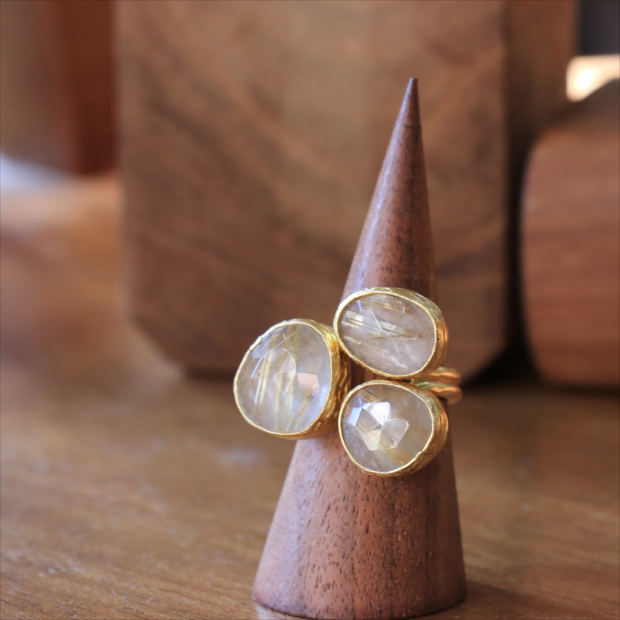 天然のクォーツに針のようなインクルージョンがはいったルチルクォーツのリングです。同じシリーズの3つの石リングの中では、やや小振りで、普段使いでも活躍しそう。肌なじみの良いカラーは違和感なく、合わせやすくおすすめです。