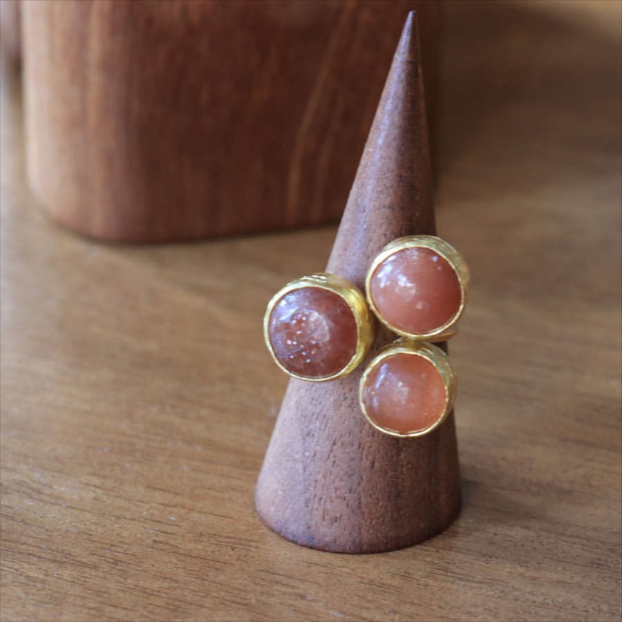 ほんのりブラウンがかったレンガの石の中に、よく見るときらきらと輝くインクルージョンがちりばめられたサンストーンが三つ並んだリング。コロンと丸形の3つの石はそれぞれ個性があり、ラメの様な輝きが光の射す角度によってきらめきます。