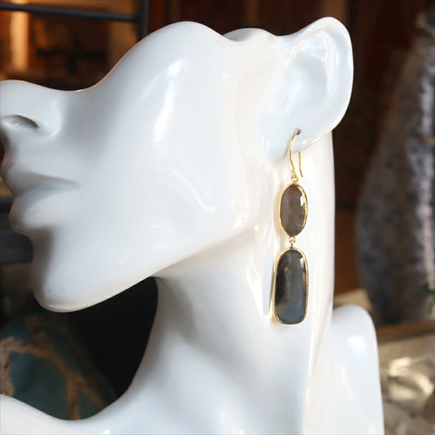 大粒の天然石を2粒つなげた贅沢なピアスです。素材の形をそのまま活かしたフレームで、すべてニュアンスの異なる一点もの。写真の現品をお届けします。