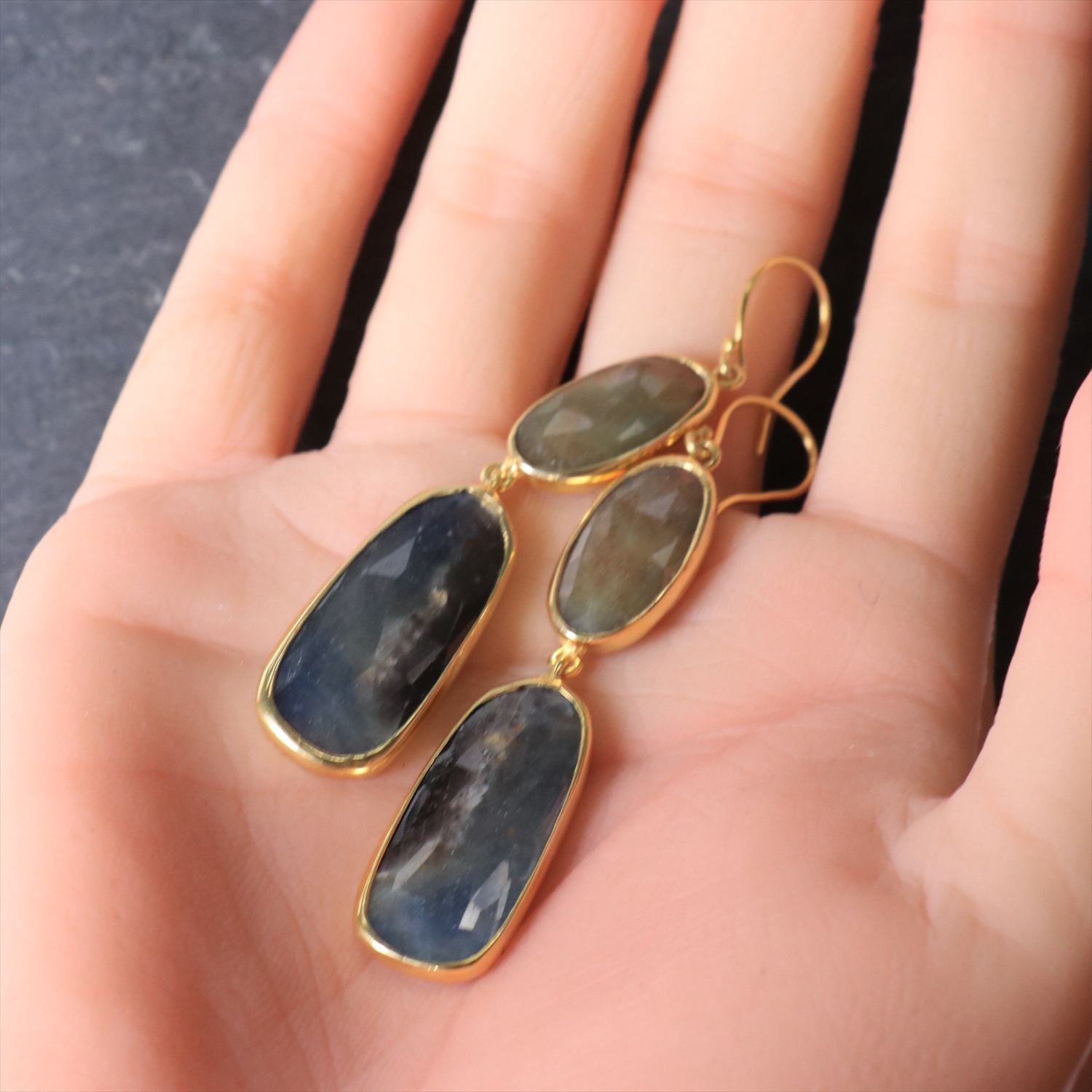 サファイアは光の当たり方によって様々に美しく変化して見えます。サファイアの産地はインド、デザインと制作はイスタンブル@トルコです。