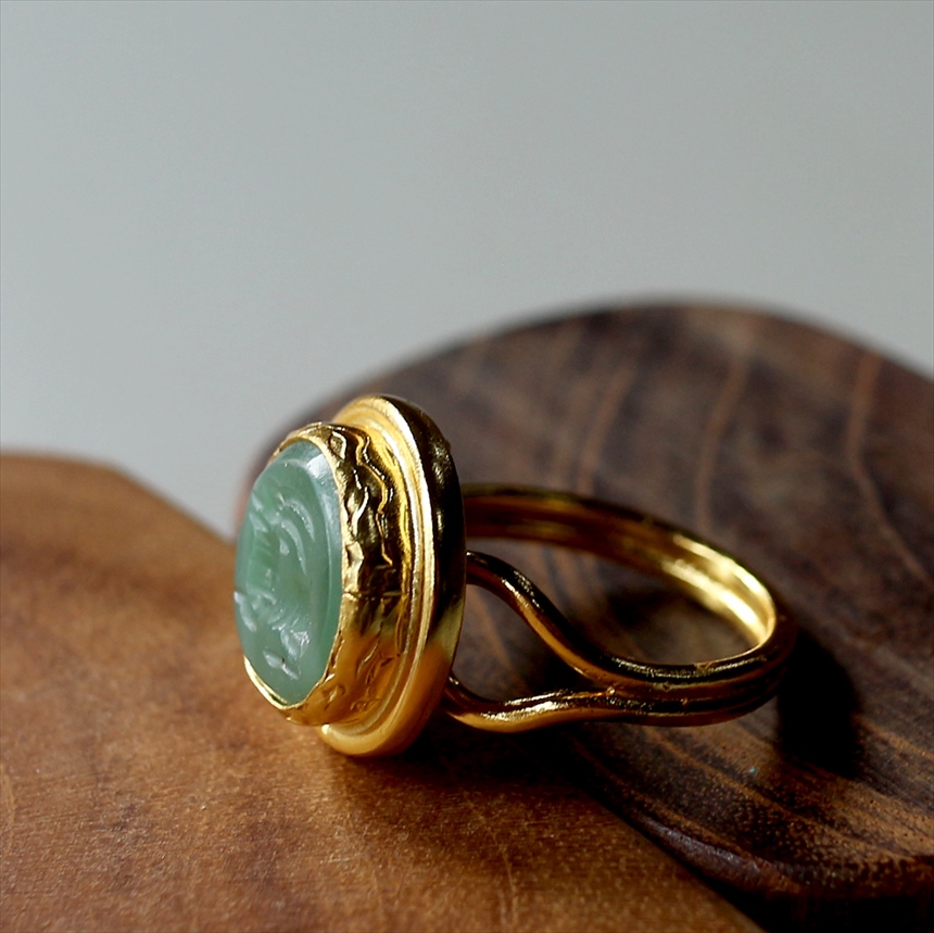 アルサメイア インタリオリング ラウンド グリーンジェイド 天然石22Kゴールドプレーテッド トルコジュエリー