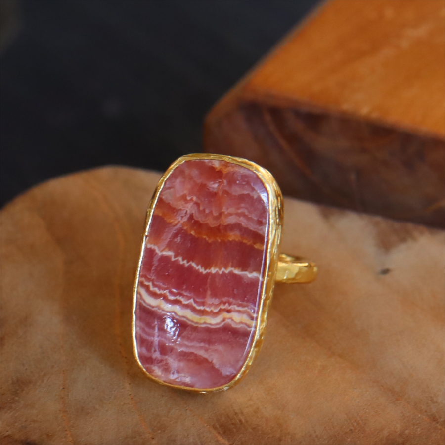 深いローズピンクから深みのあるオレンジがかった色まで、幾重にも重なった縞模様が印象的なロードクロサイト(Rhodochrosite)のリング。まるで大地の記憶を閉じ込めた地層のような模様は、自然が長い時間をかけて生み出した一点ものの表情です。同じ石はふたつと存在せず、その個性こそがこのリングの最大の魅力。眺めるたびに、新しい表情を見せてくれます。