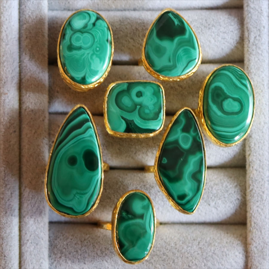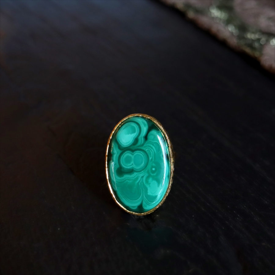 大粒のマラカイトを引き立てるため、デザインはあえてシンプルに。大胆なのにどこか落ち着きがあり、指先にしっくりなじむバランス感も魅力です。