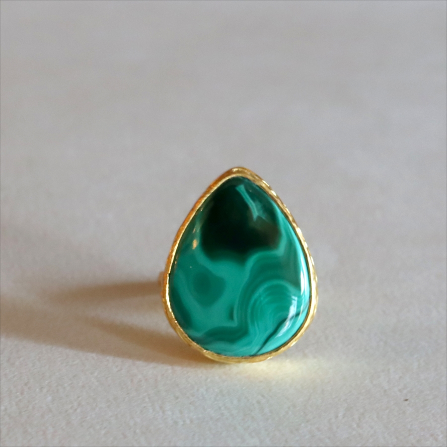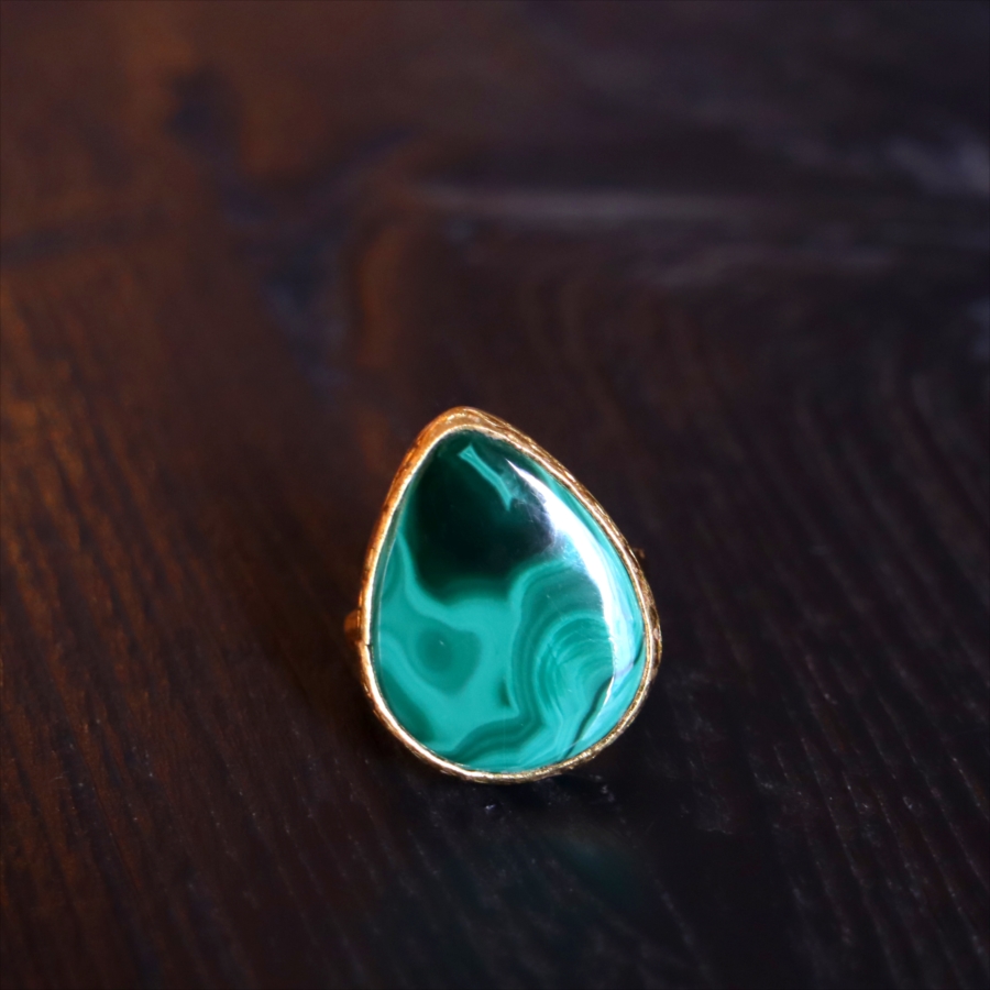 大粒のマラカイトを引き立てるため、デザインはあえてシンプルに。大胆なのにどこか落ち着きがあり、指先にしっくりなじむバランス感も魅力です。
