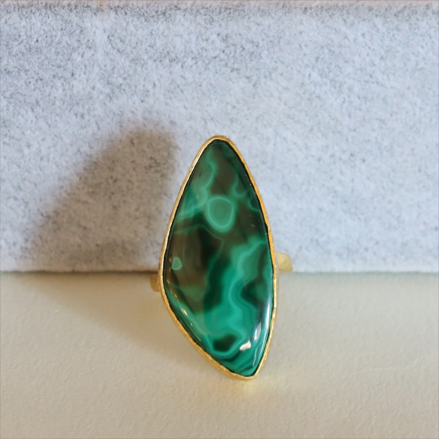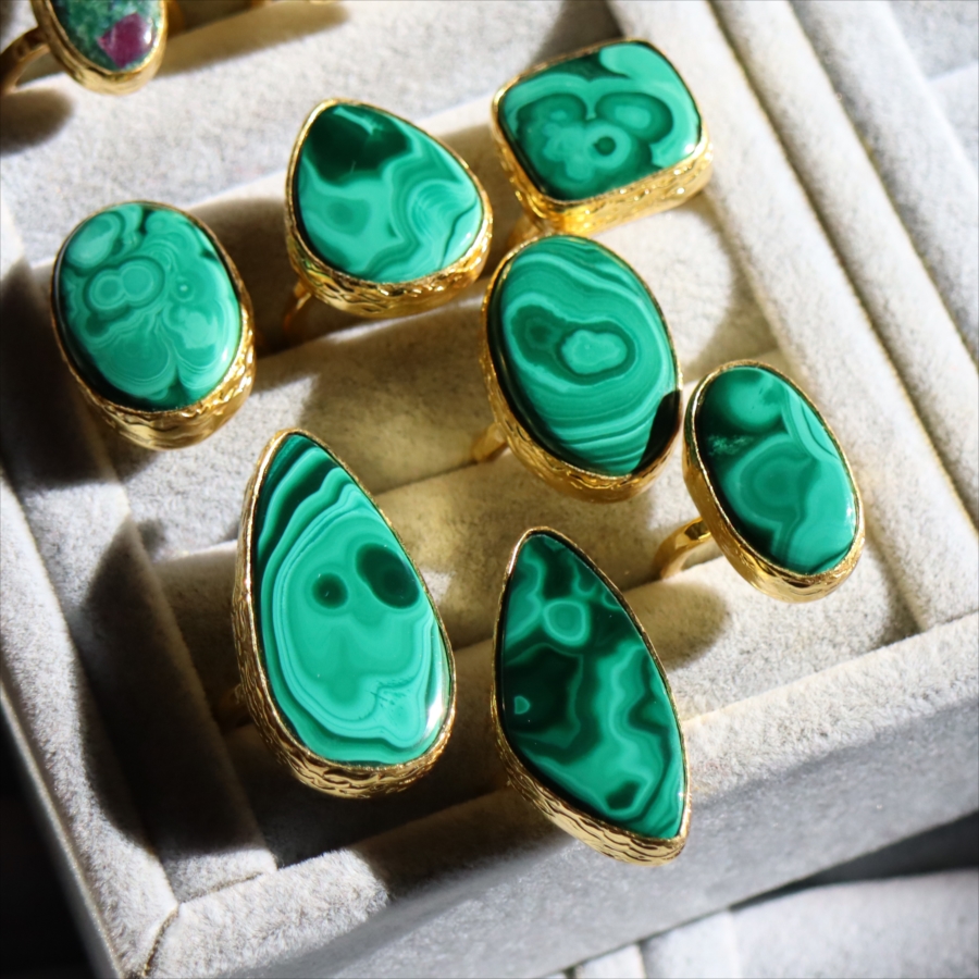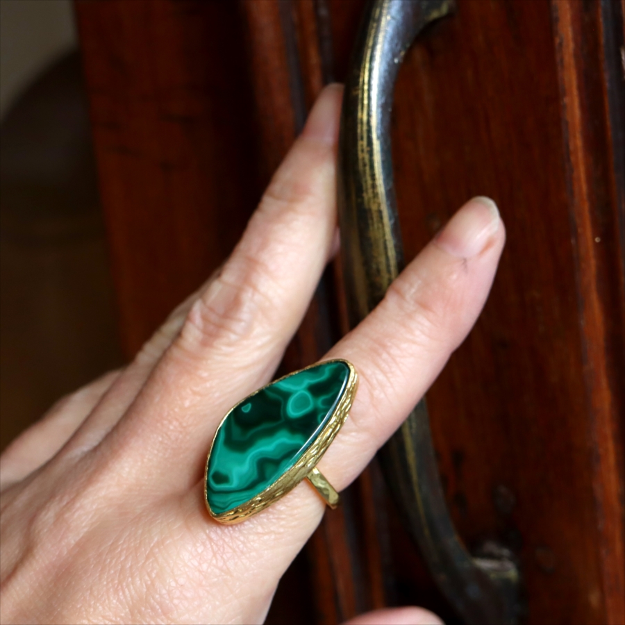 大粒のマラカイトを引き立てるため、デザインはあえてシンプルに。大胆なのにどこか落ち着きがあり、指先にしっくりなじむバランス感も魅力です。