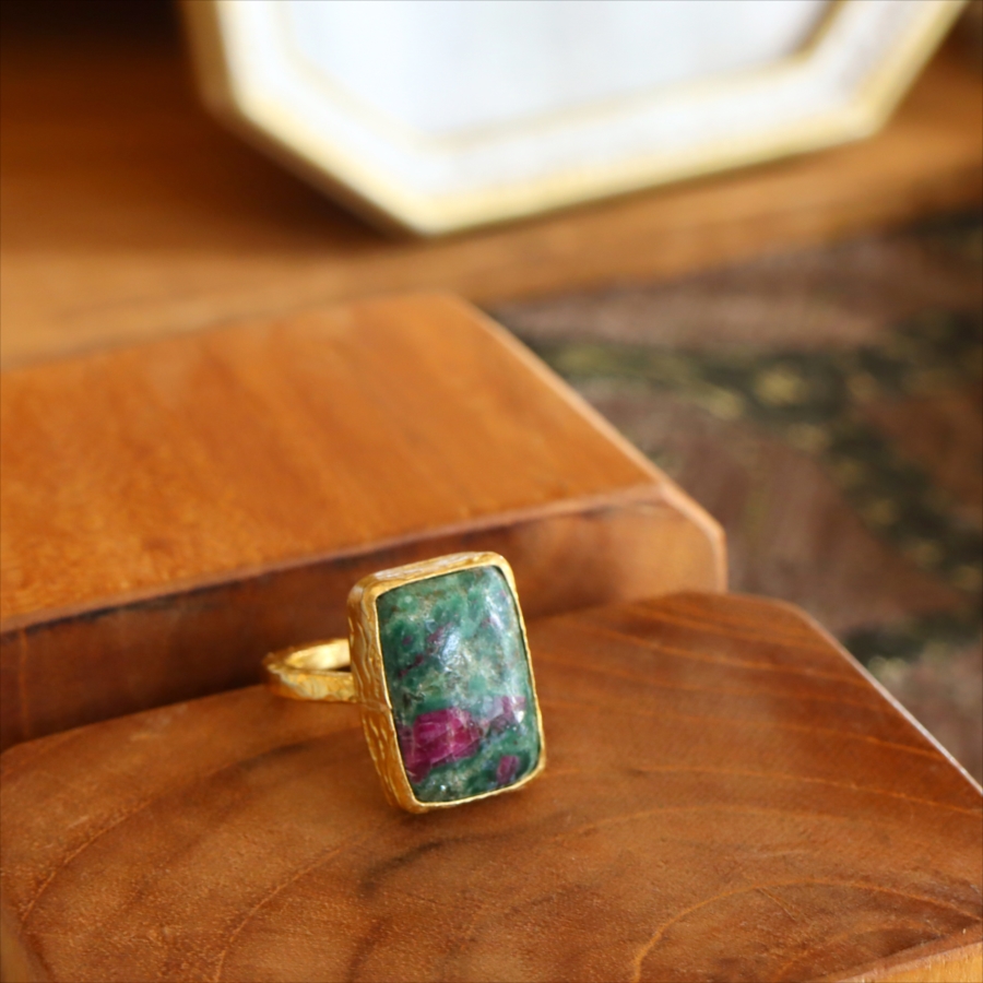 グリーンとワインレッドのエキゾチックなカラーが美しい、ルビーインゾイサイト(Ruby in Zoisite)のリング。鮮やかな緑色のゾイサイトの中に、紫からワインレッドのルビーの結晶が混ざり合った天然の変成岩です。まるで大地が長い時間をかけて描いた抽象画のよう。ひとつとして同じ表情はなく、自然が生み出したアートをそのまま楽しめるのが、この石の最大の魅力です。