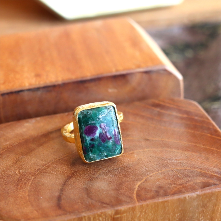 グリーンとワインレッドのエキゾチックなカラーが美しい、ルビーインゾイサイト(Ruby in Zoisite)のリング。鮮やかな緑色のゾイサイトの中に、紫からワインレッドのルビーの結晶が混ざり合った天然の変成岩です。まるで大地が長い時間をかけて描いた抽象画のよう。ひとつとして同じ表情はなく、自然が生み出したアートをそのまま楽しめるのが、この石の最大の魅力です。