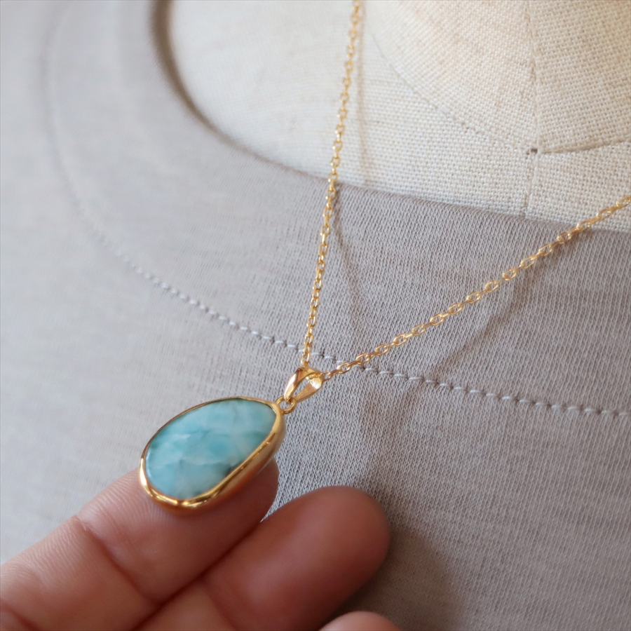 ブルーとホワイトの波模様は、カリブ海の宝石とも呼ばれ、人気の高いストーンのひとつです。こちらのペンダントは、2cm以上もある大粒の良質なラリマーをセレクトしました。