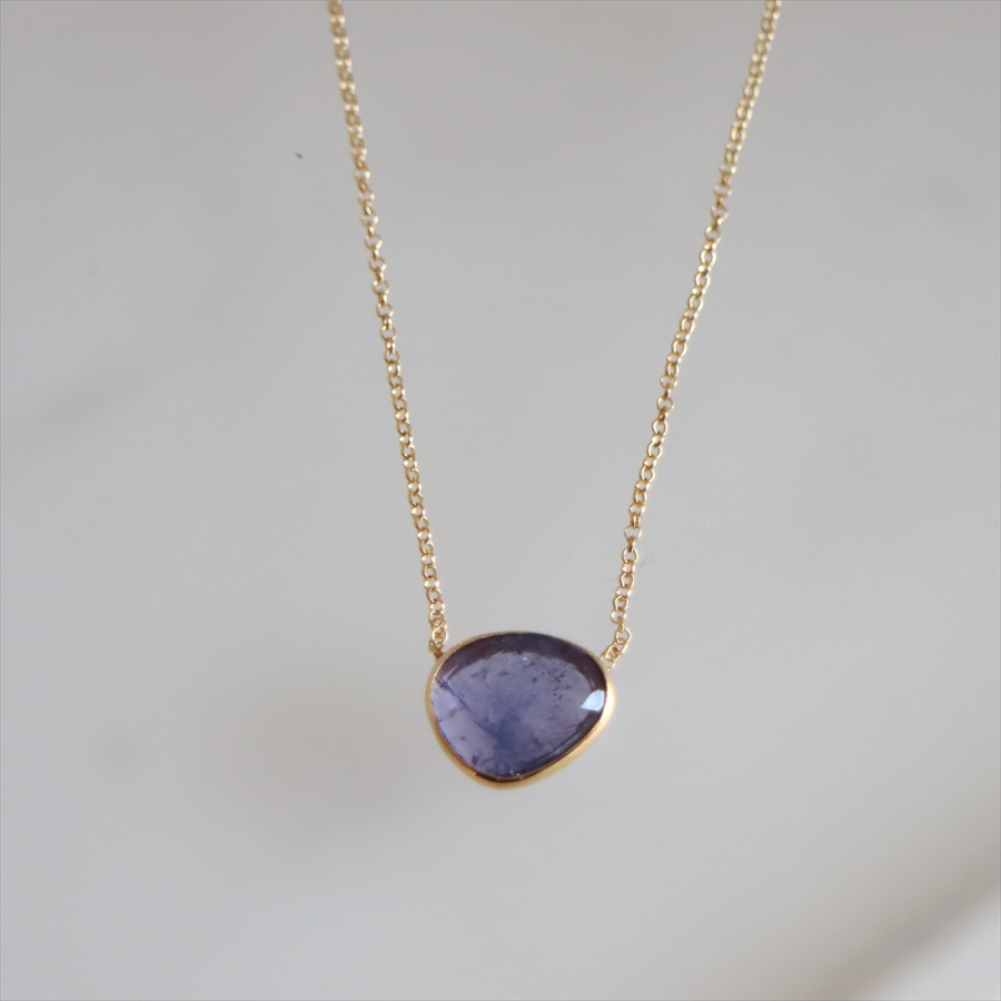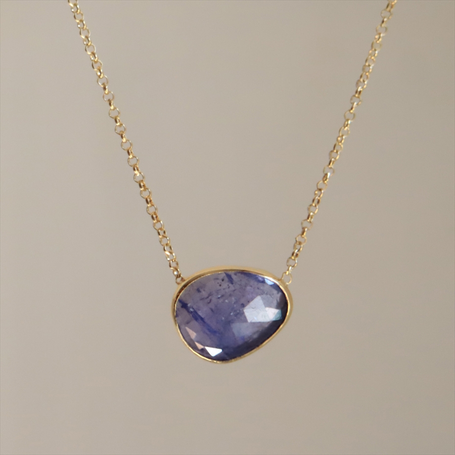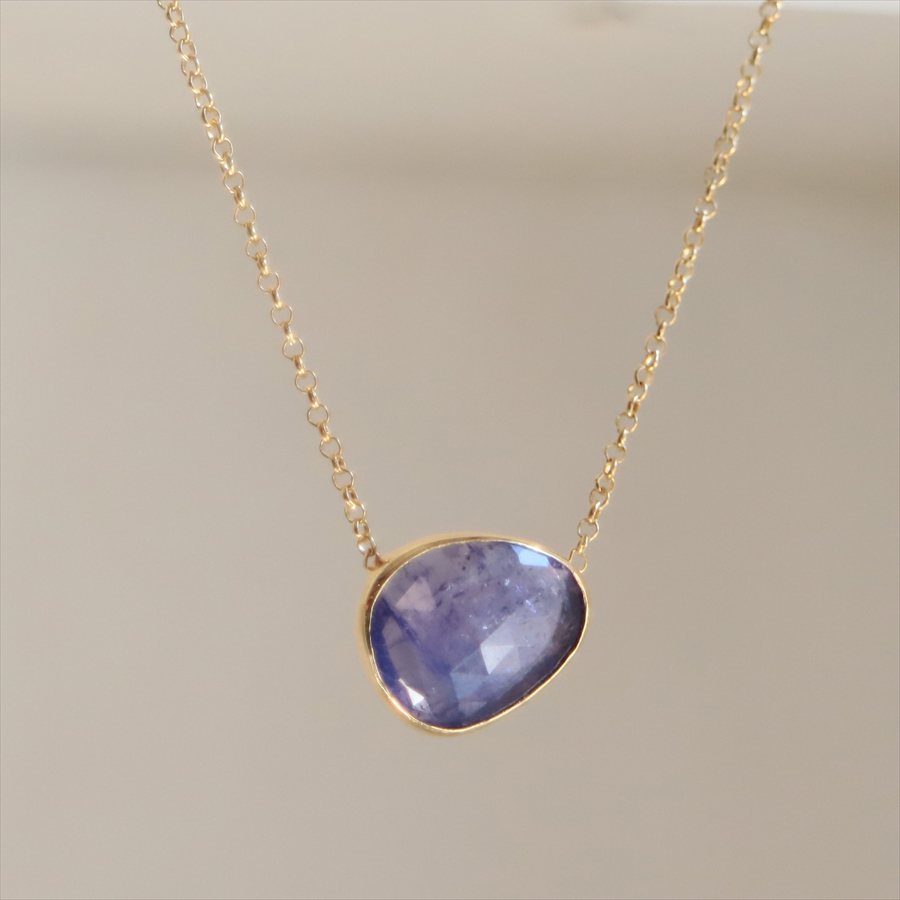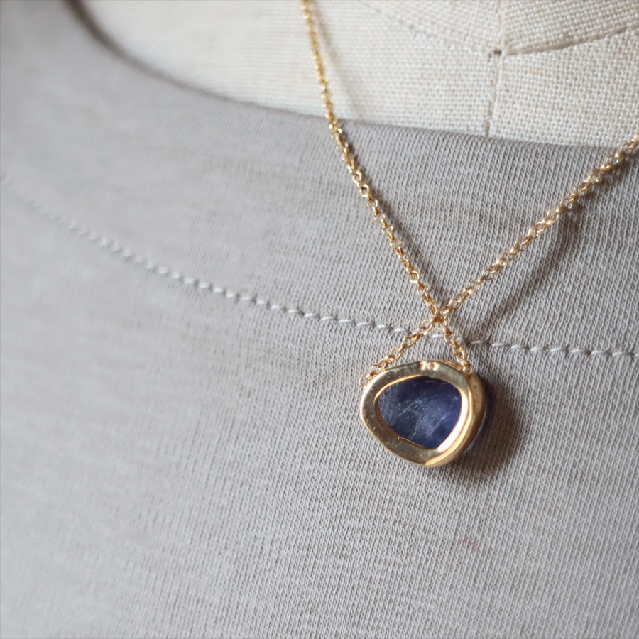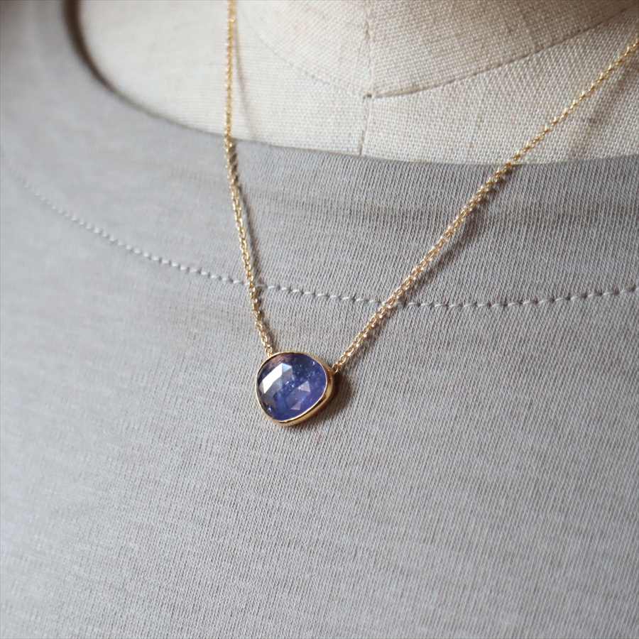 深いブルーからバイオレットまで様々な色をあわせ持つタンザナイトのネックレスです。蛍光灯の下では、きらっとネオンのように光って見えることも。ランダムにカットされた石がハンドメイドらしい温かみを感じられる一点もののネックレスです。