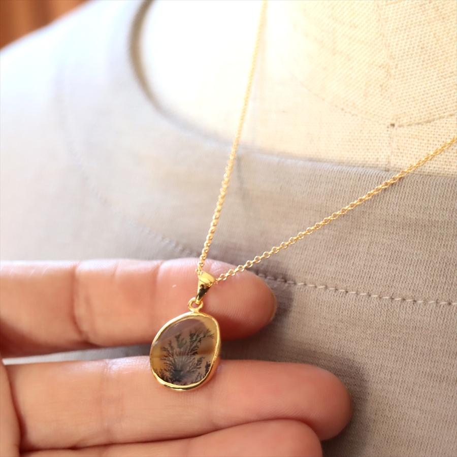 まるで樹木のシルエットのよう!でもこれは自然が創り出した鉱物の結晶が、枝のように広がったものなのだそうです。霧の中にたたずむ森や、冬枯れの枝先のようにも見えるその姿は、眺めるたびに想像をかき立てる幻想的な美しさを秘めています。同じものはふたつとない、地球からの贈り物です。自然が描いた小さな風景を、そっと身にまとってみてくださいね。