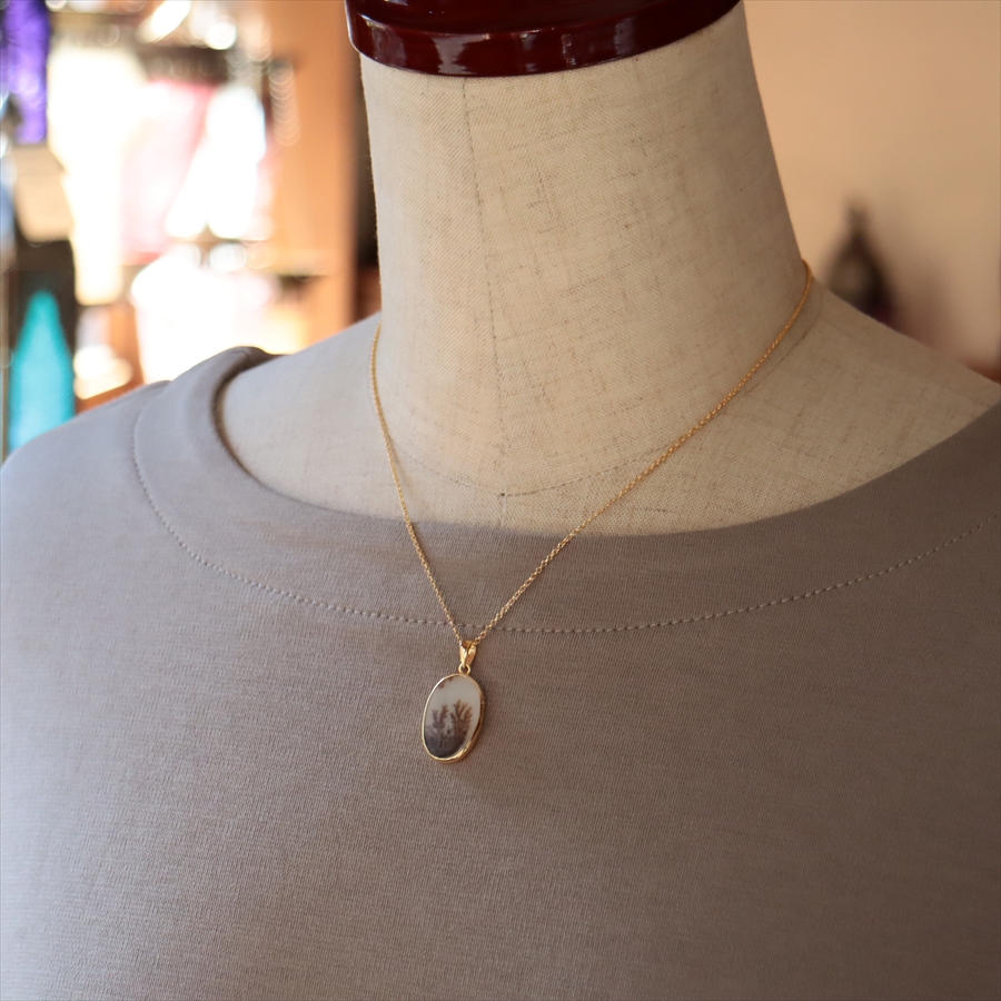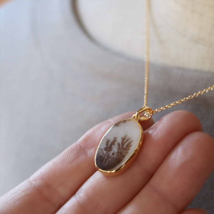 まるで樹木のシルエットのよう!でもこれは自然が創り出した鉱物の結晶が、枝のように広がったものなのだそうです。霧の中にたたずむ森や、冬枯れの枝先のようにも見えるその姿は、眺めるたびに想像をかき立てる幻想的な美しさを秘めています。同じものはふたつとない、地球からの贈り物です。自然が描いた小さな風景を、そっと身にまとってみてくださいね。