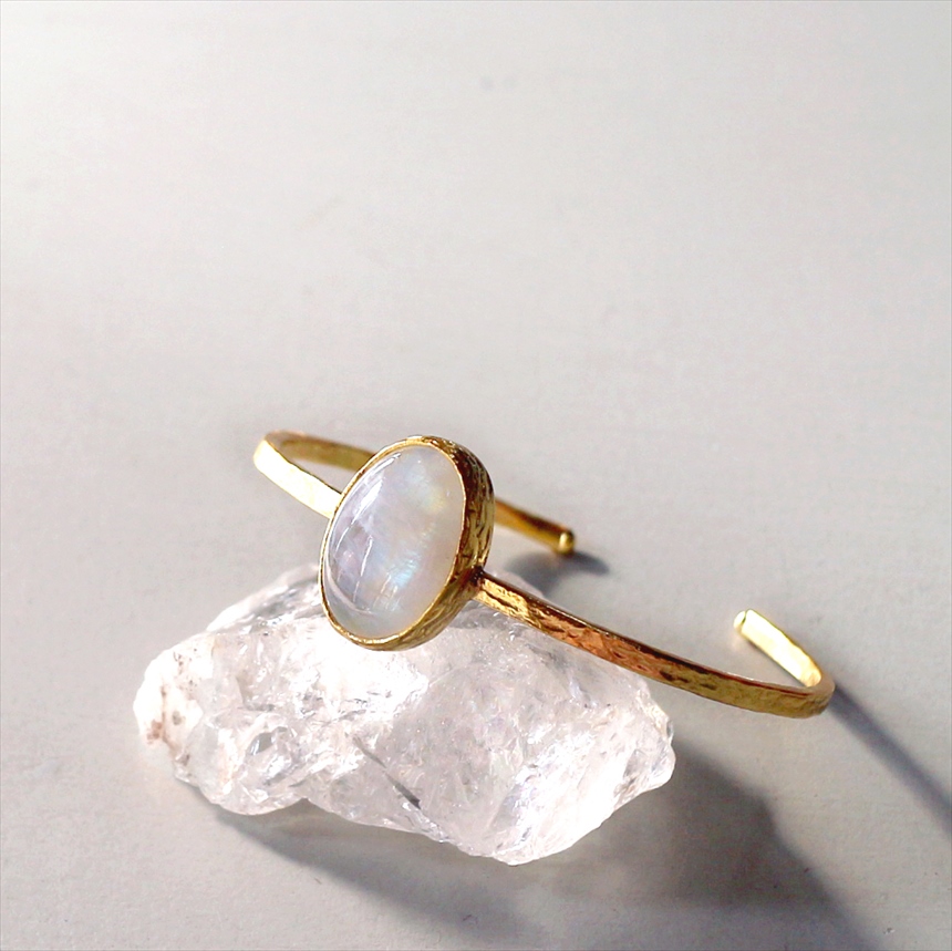 神秘的な月光を閉じ込めたかのような、美しいムーンストーンのバングルです。ぷっくりとした厚みのあるカボションカットが施されているため、光を内側からとらえ、虹色のシラーがより立体的に、そしてダイナミックに現れます。華奢なゴールドアームとのバランスが洗練された雰囲気を演出します。