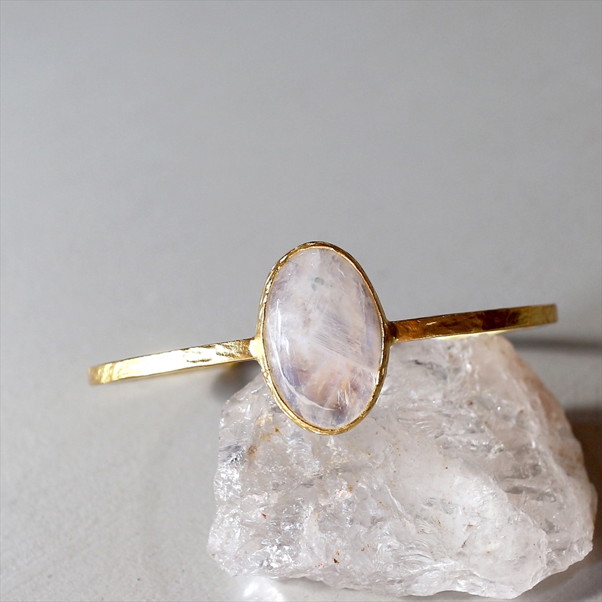 神秘的な月光を閉じ込めたかのような、美しいムーンストーンのバングルです。ぷっくりとした厚みのあるカボションカットが施されているため、光を内側からとらえ、虹色のシラーがより立体的に、そしてダイナミックに現れます。華奢なゴールドアームとのバランスが洗練された雰囲気を演出します。