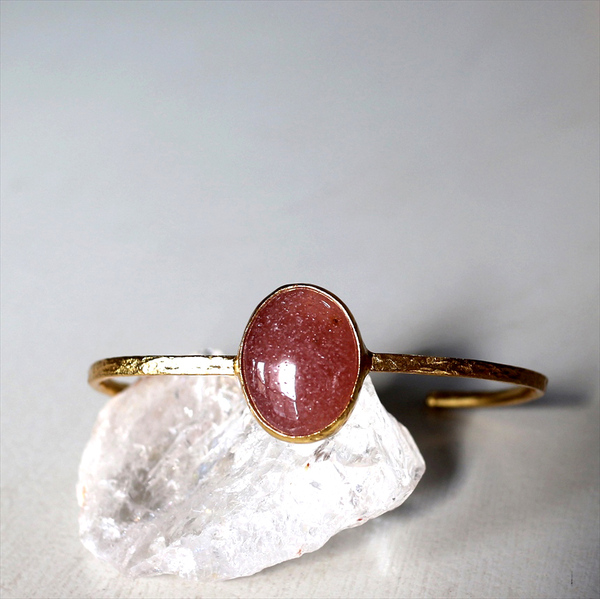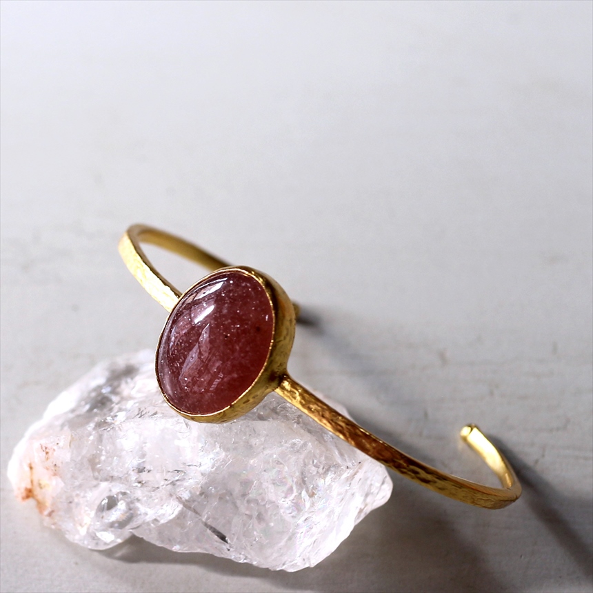 大粒の深みあるくすみレッドのストロベリークォーツのゴールドバングル。打ち加工がされたシンプルなゴールドアームは、無駄なデザインを省きクールな印象です。
