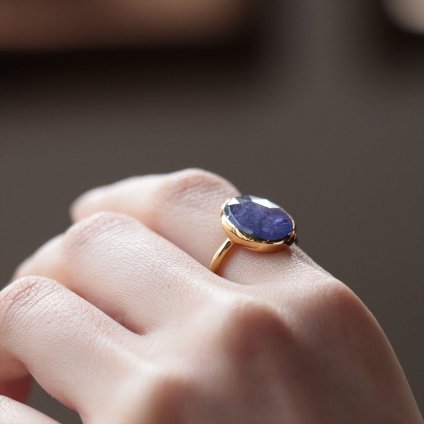 青紫や群青色、見る角度によって、グリーンやピンクなど様々な色彩の混じりあうブルーカラーが大変美しい石、タンザナイト。華やかで存在感あるリングです。