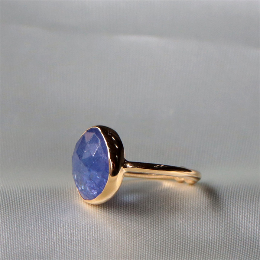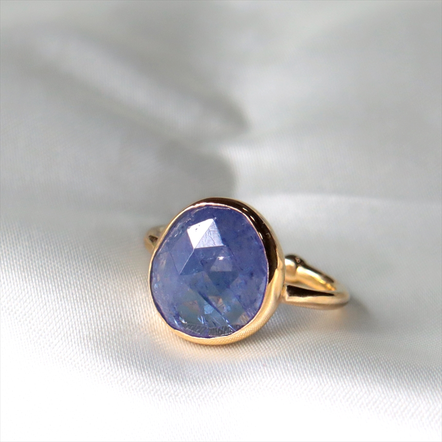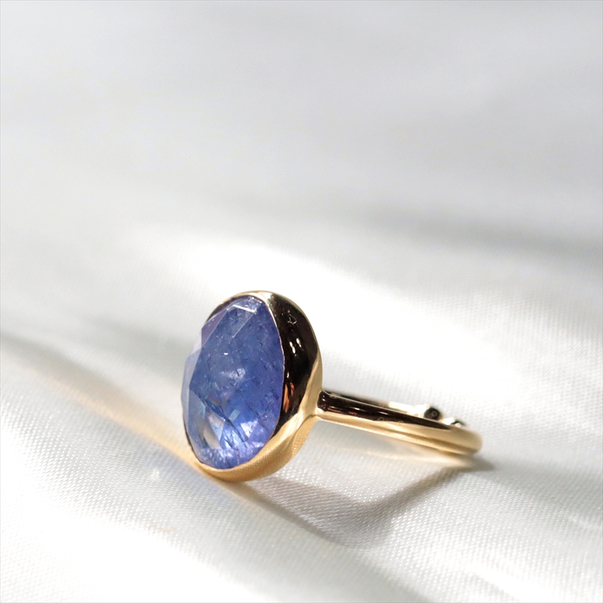 青紫や群青色、見る角度によって、グリーンやピンクなど様々な色彩の混じりあうブルーカラーが大変美しい石、タンザナイト。華やかで存在感あるリングです。