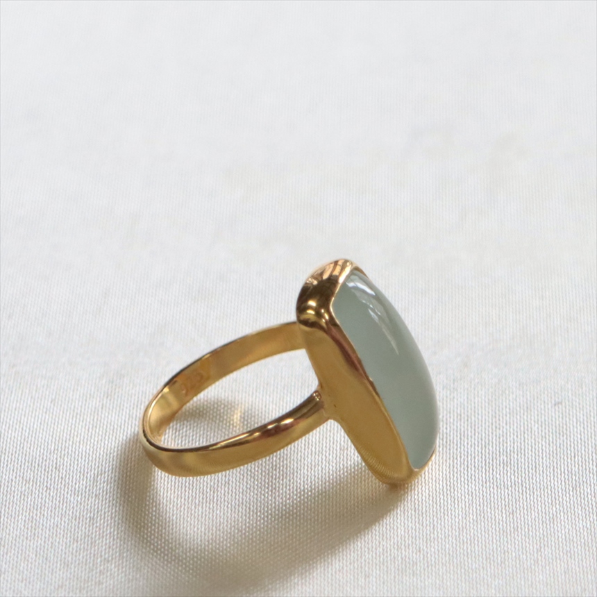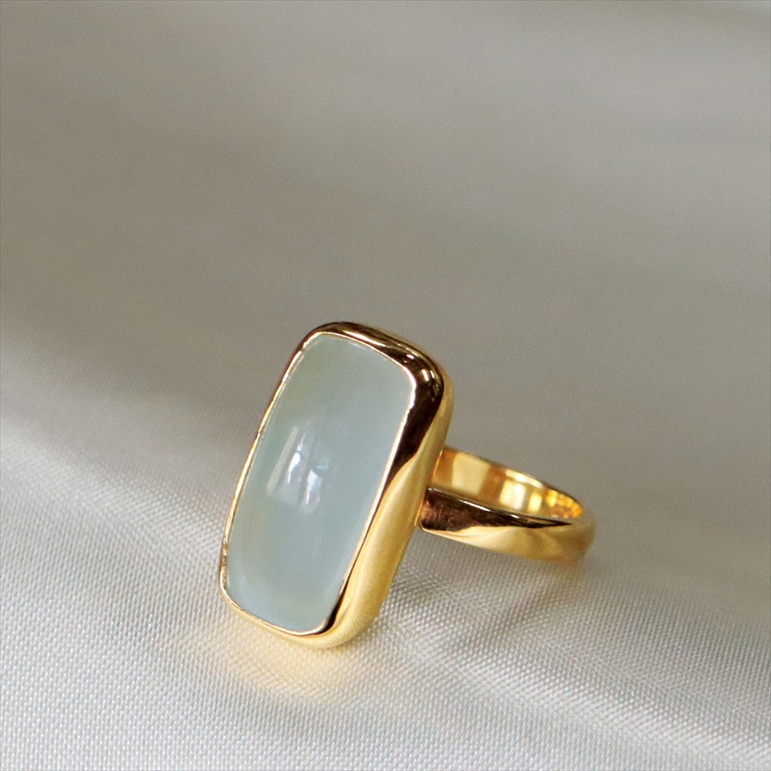 瑞々しく輝くグリーンがかったアクアマリンのリングです。厚みのあるカボションカットが、内側から溢れるような、とろみのある光を優しく取り込みます。スクエアフォルムが甘さを抑え、知的な印象を与えます。