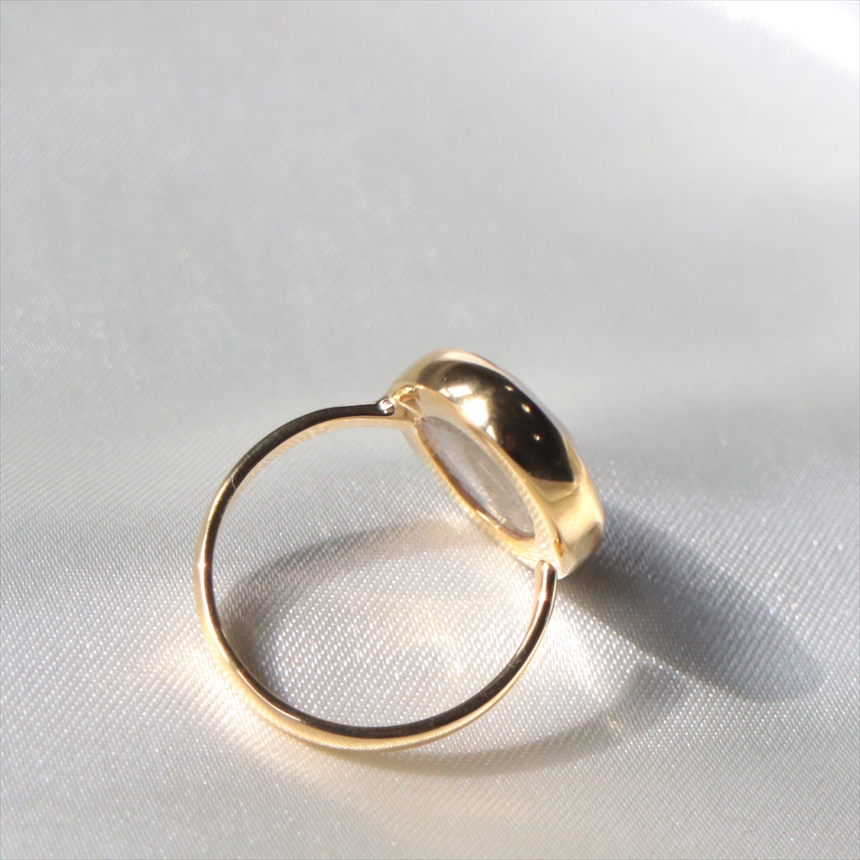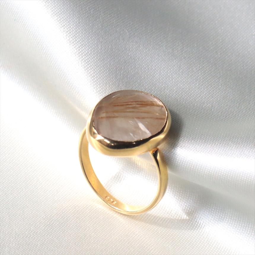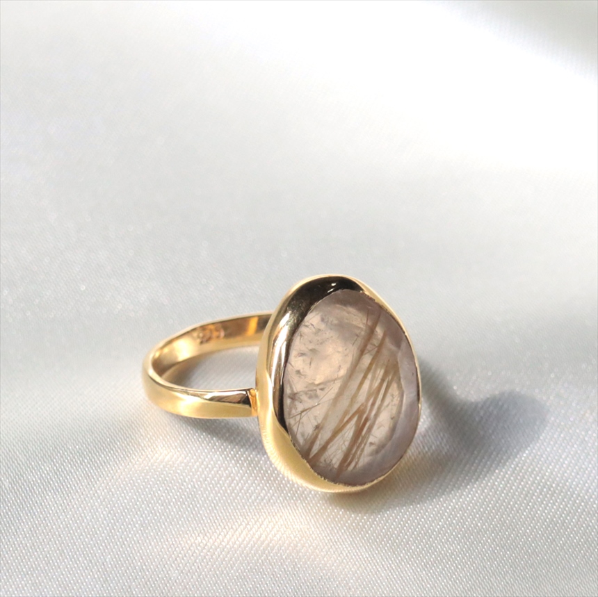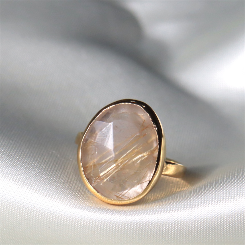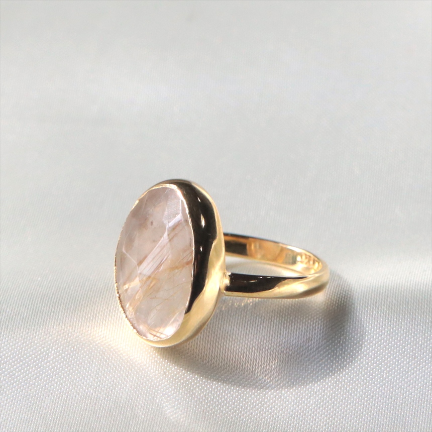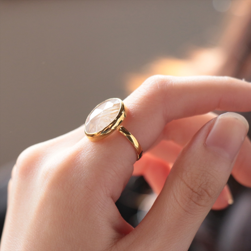 クリアなクォーツの中に繊細なゴールドの針(ルチル)が閉じ込められた、自然が生んだ神秘ともいえる、ルチルクォーツのリングです。肌に溶け込むヌーディーな色調にゴールドが煌めき、手元をより洗練された知的な印象にみせてくれます。