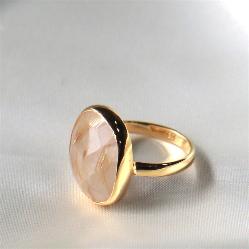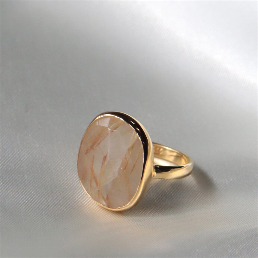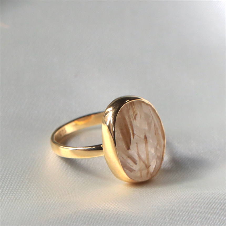 クリアなクォーツの中に繊細なゴールドの針(ルチル)が閉じ込められた、自然が生んだ神秘ともいえる、ルチルクォーツのリングです。肌に溶け込むヌーディーな色調にゴールドが煌めき、手元をより洗練された知的な印象にみせてくれます。