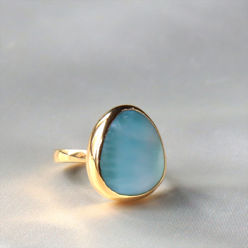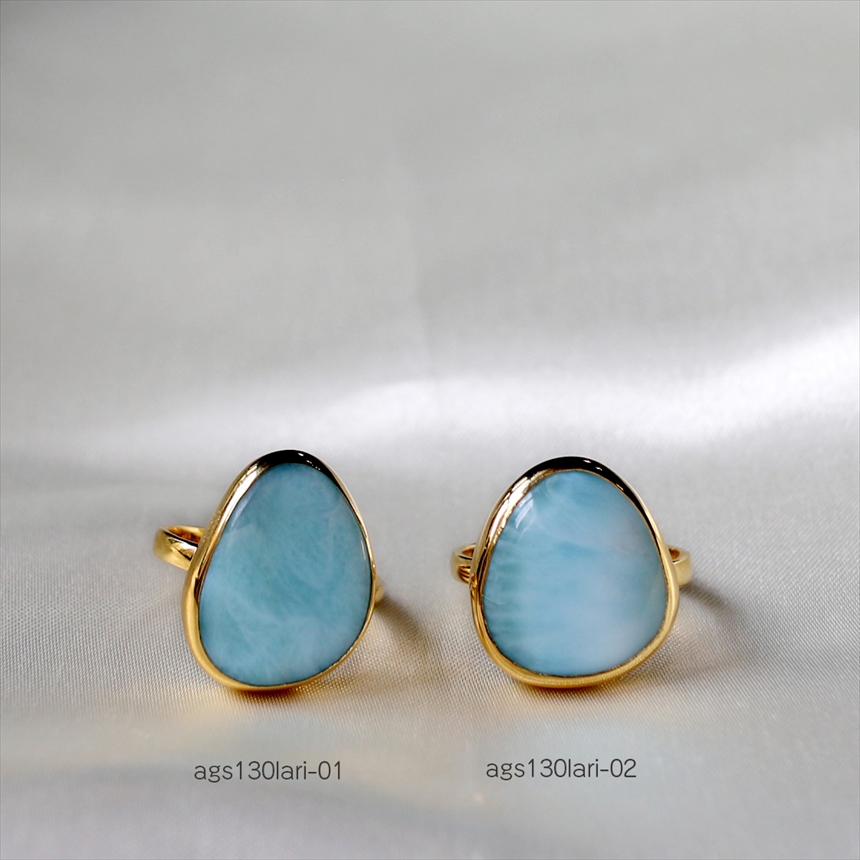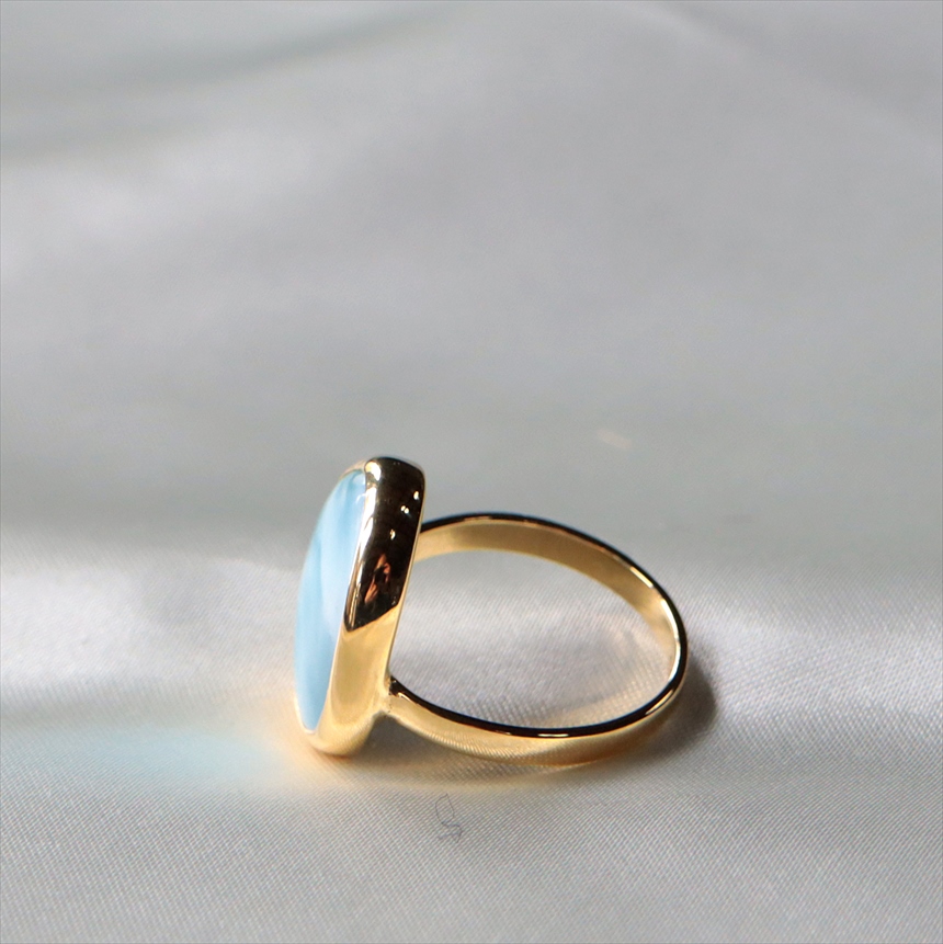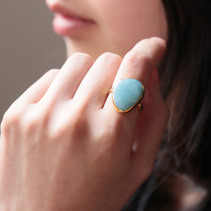 ラリマー特有の乳白色が混ざったブルーに、波模様が見えるリングです。丸みを帯びた、柔らかな三角形。この有機的なラインが、ラリマーの優しいブルーと相まって、手元に穏やかで上品な印象を与えます。