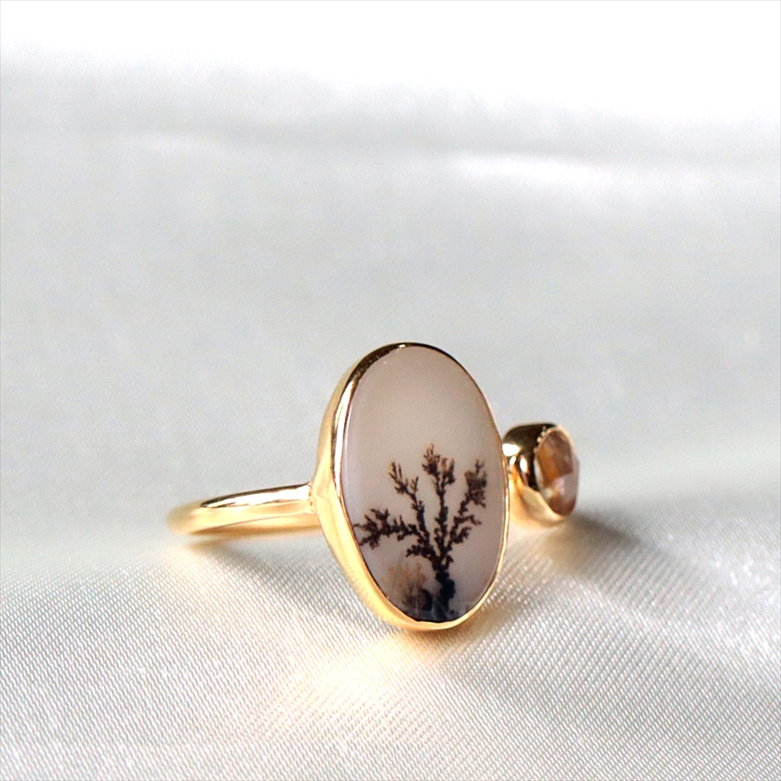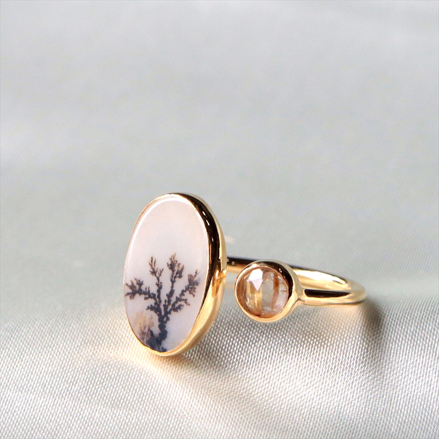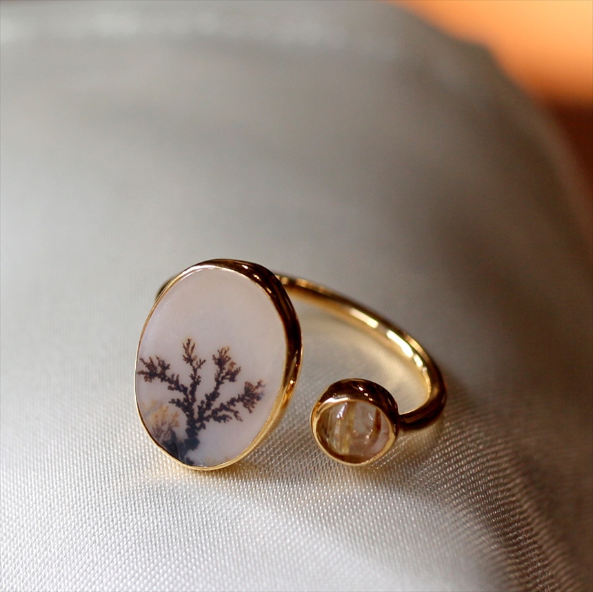やわらかな乳白色の水晶の中にシダ植物のような模様(内包物)が広がるデンドライトと、黄金の針が輝くルチルクォーツを配した、まるで指先の美術館のようなリングです。一粒ごとに異なる絵画のような天然石の表情が、手元を見るたびに深い癒やしを与えてくれます。