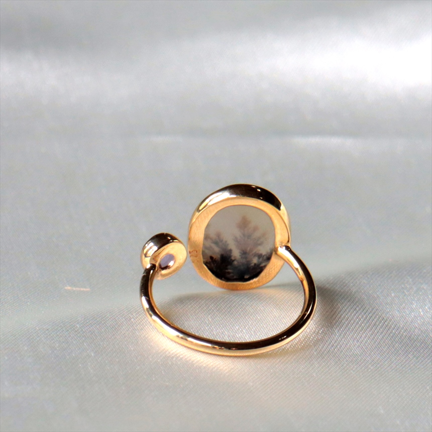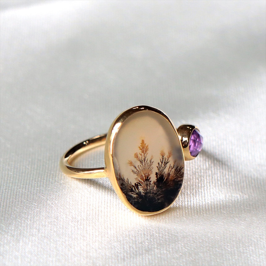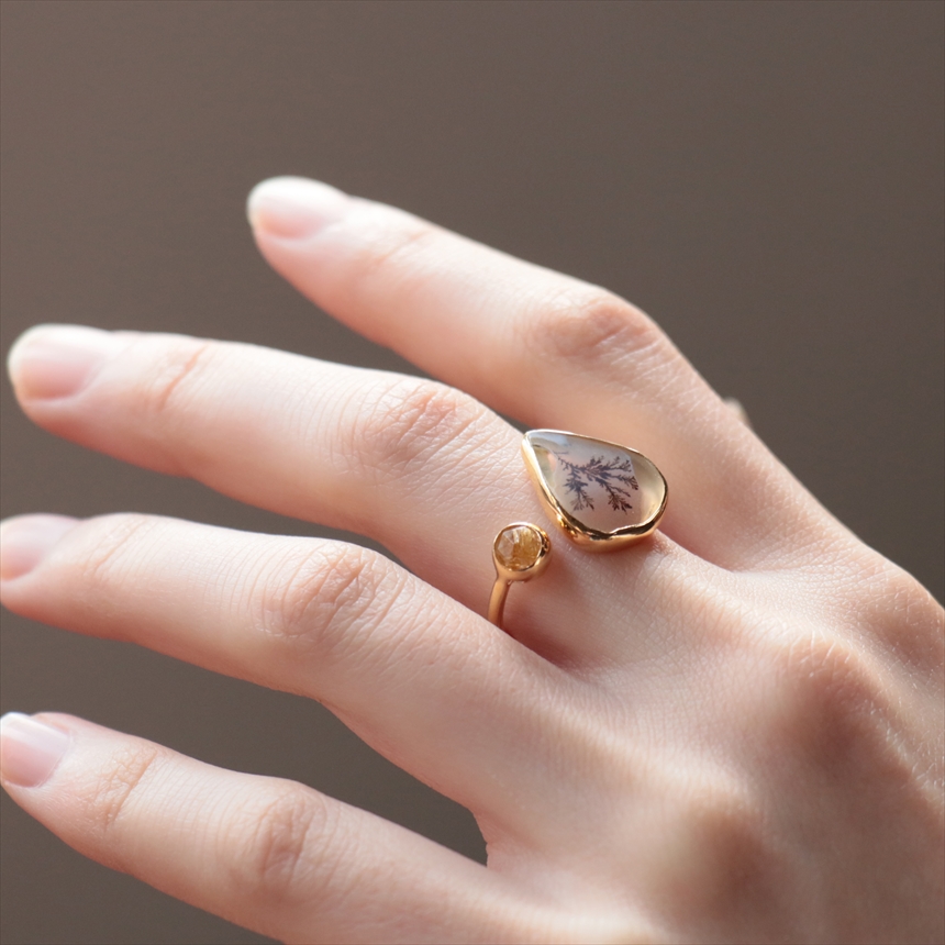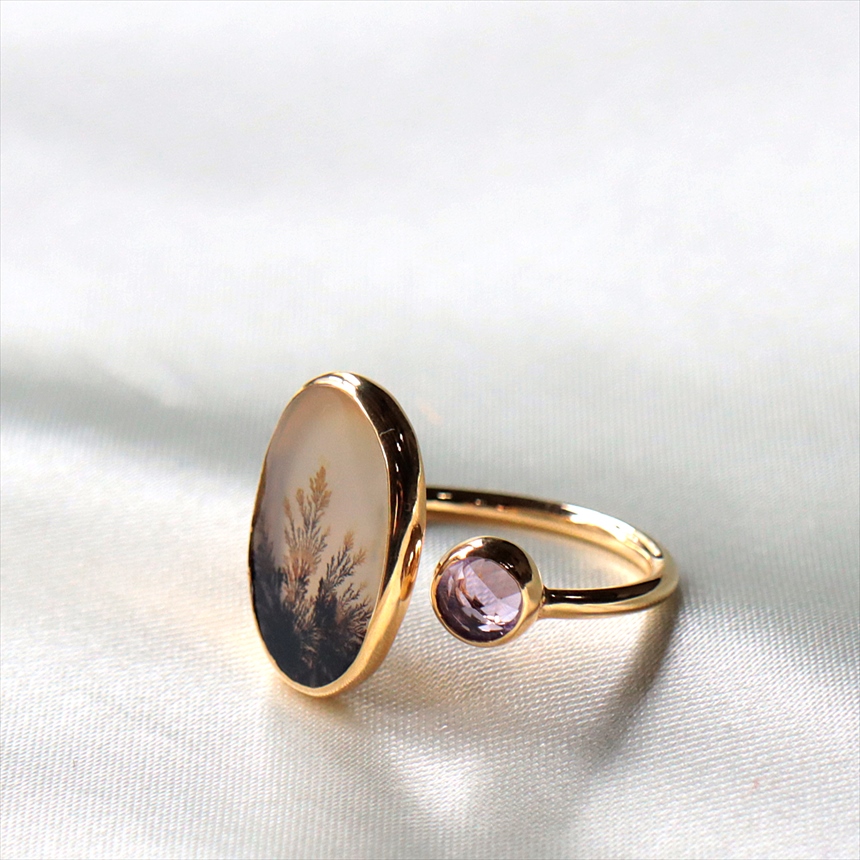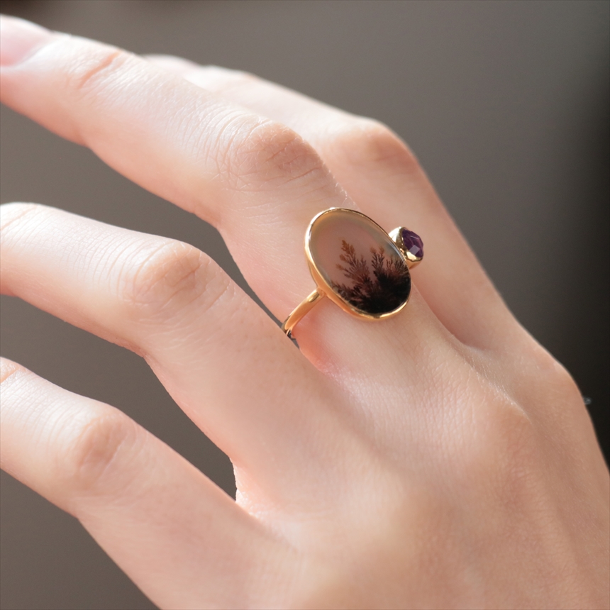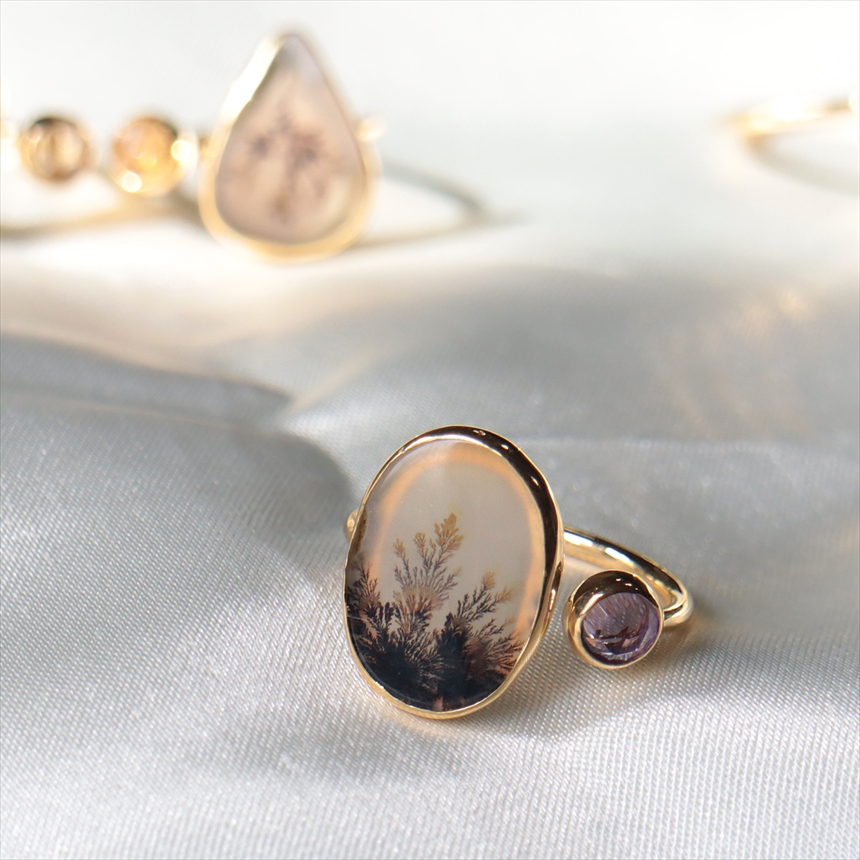 やわらかな乳白色の水晶の中にシダ植物のような模様(内包物)が広がるデンドライトと、薄紫色のアメシストを配した、まるで指先の美術館のようなリングです。一粒ごとに異なる絵画のような天然石の表情が、手元を見るたびに深い癒やしを与えてくれます。