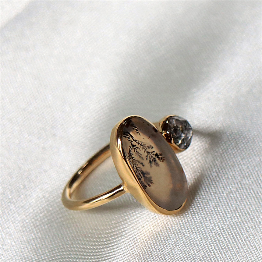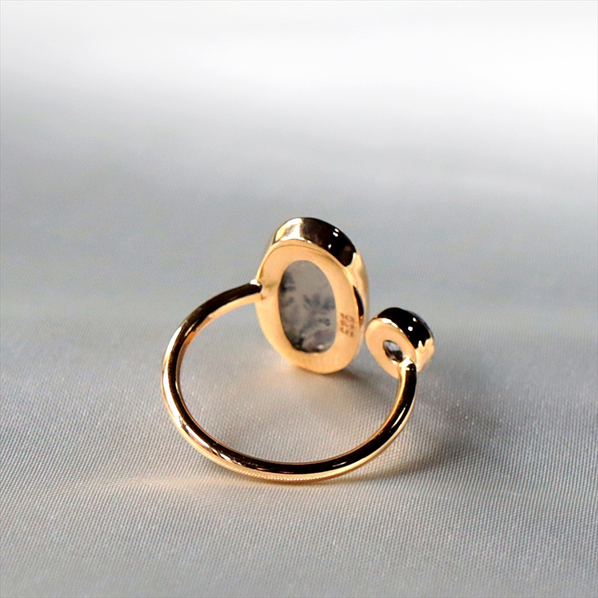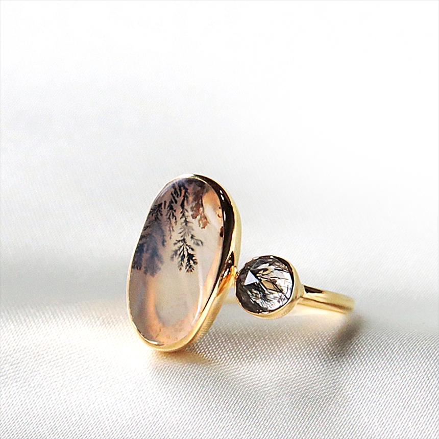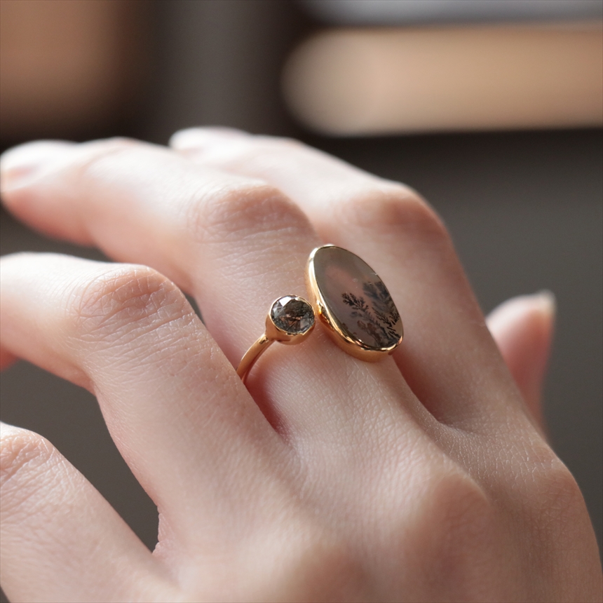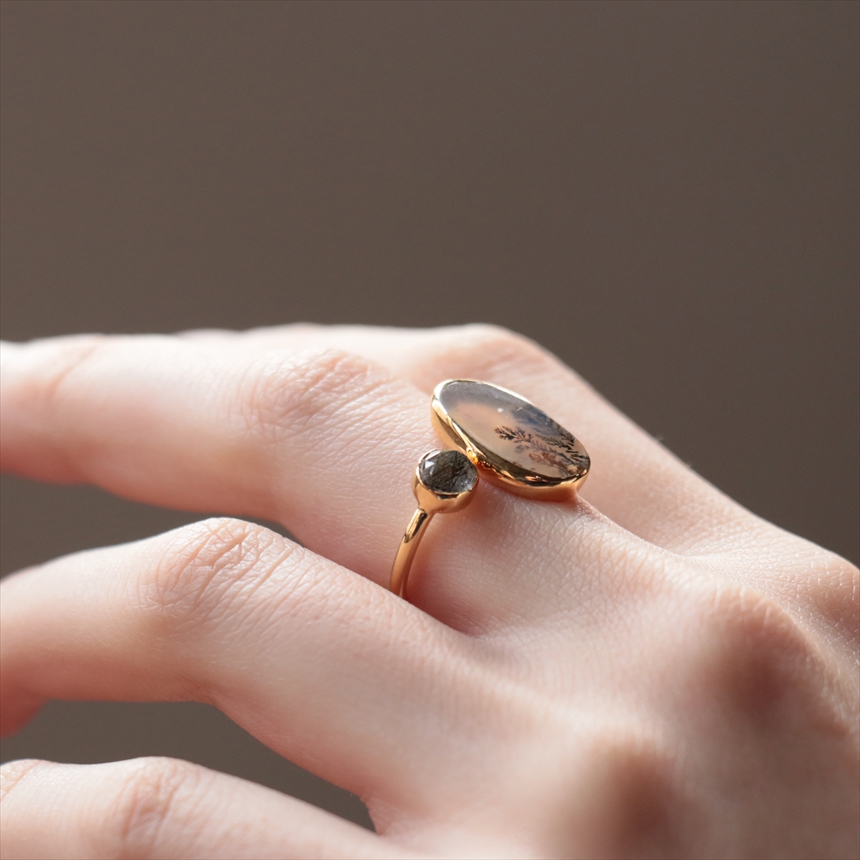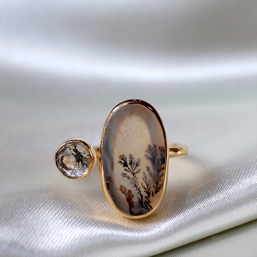 やわらかな乳白色の水晶の中にシダ植物のような模様(内包物)が広がるデンドライトと、黒い針が輝くブラックルチルクォーツを配した、まるで指先の美術館のようなリングです。一粒ごとに異なる絵画のような天然石の表情が、手元を見るたびに深い癒やしを与えてくれます。