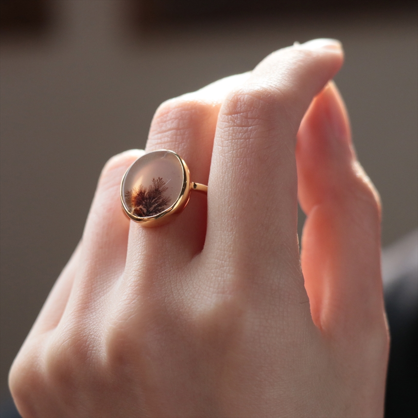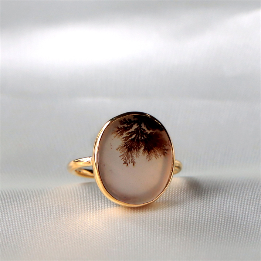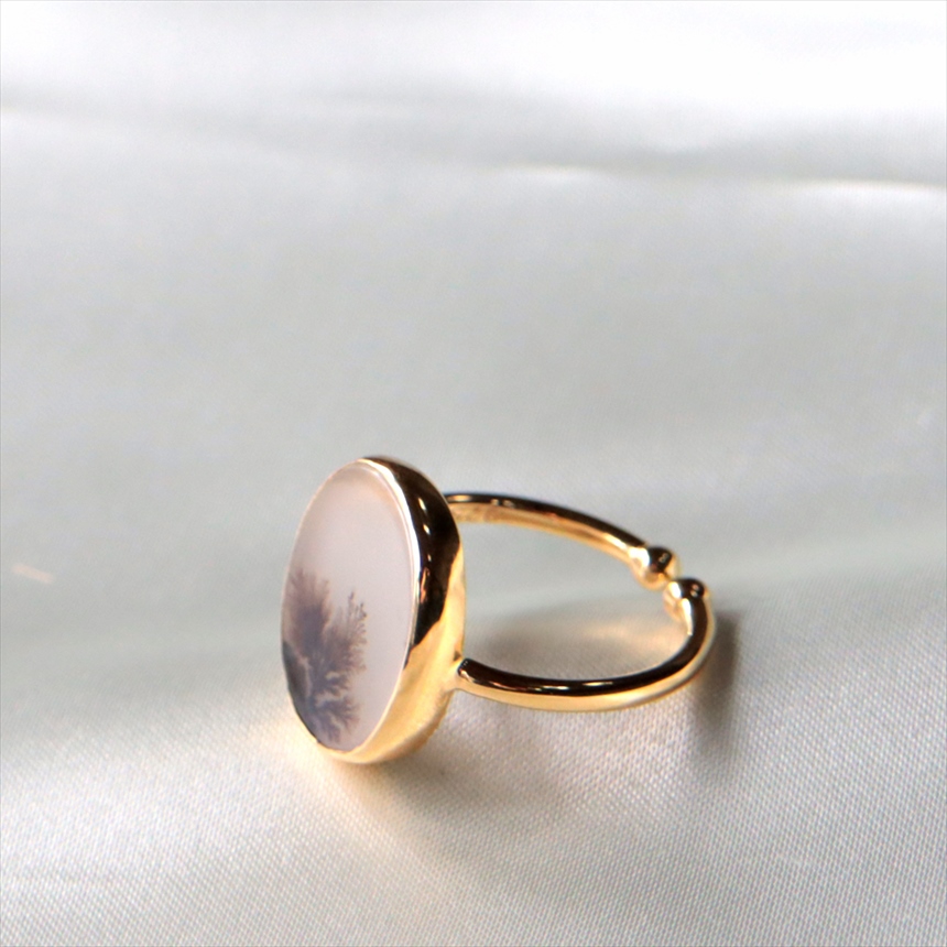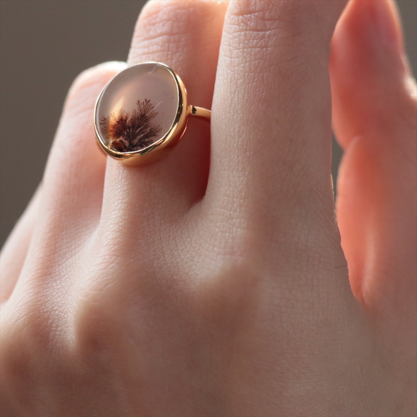 やわらかな乳白色の水晶の中にシダ植物のような模様(内包物)が広がるデンドライトのリングです。一粒ごとに異なる絵画のような天然石の表情が、手元を見るたびに深い癒やしを与えてくれます。