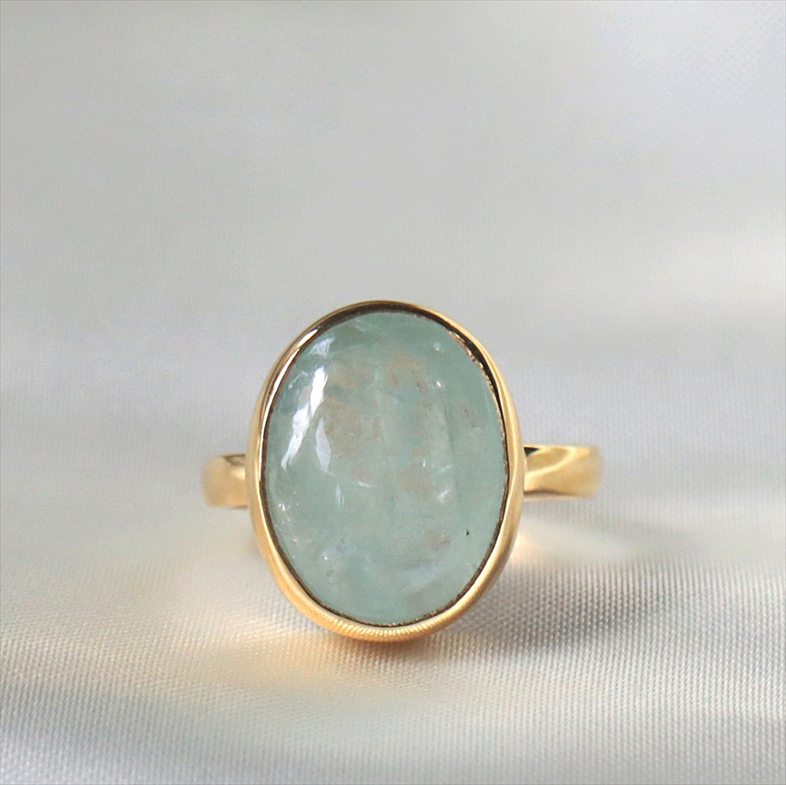 瑞々しく輝くグリーンがかったアクアマリンのリングです。厚みのあるカボションカットが、内側から溢れるような、とろみのある光を優しく取り込みます。ぷるんとした縦長のオーバルフォルムは、指をほっそりと長く見せてくれる嬉しい視覚効果があります。