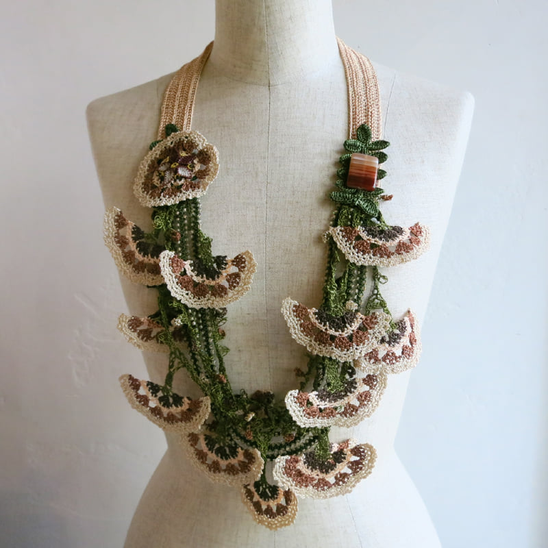トルコの伝統的な手芸「オヤ」をモチーフにして、手編みで作られたボリュームのあるゴージャスなネックレスです。エフェオヤとは、トルコの地中海地方で、婚礼の際に男女ともにスカーフや襟元を華やかに飾るために使われたモチーフです。